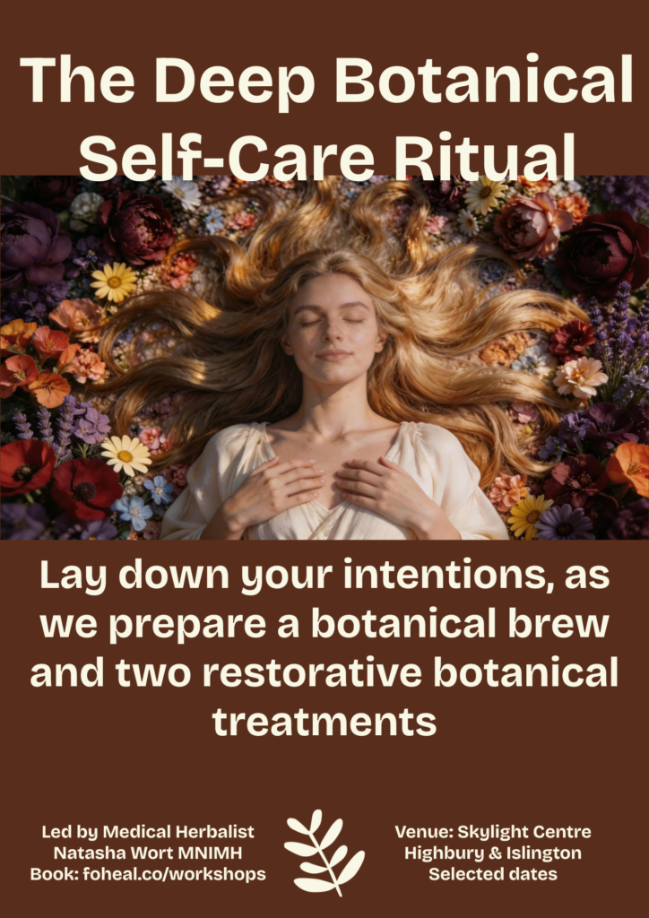 Join me in person for a deep botanical self-care evening, led by myself Medical Herbalist Tash of Foheal Herbal Clinic, where you will learn a little about and choose the herb(s) that serve your physical and emotional calling, creating a herbal infusion mixed with your intentions for release and transformation. Then we will prepare two natural treatments.